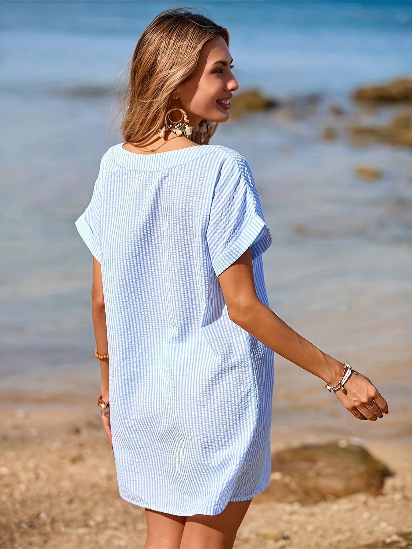 Perfekt for stranden eller late feriedager, denne kjolen tilfører komfort og stil til enhver anledning. Den er enkel å pakke og bruke, noe som gjør den til et must-have for varme dager.