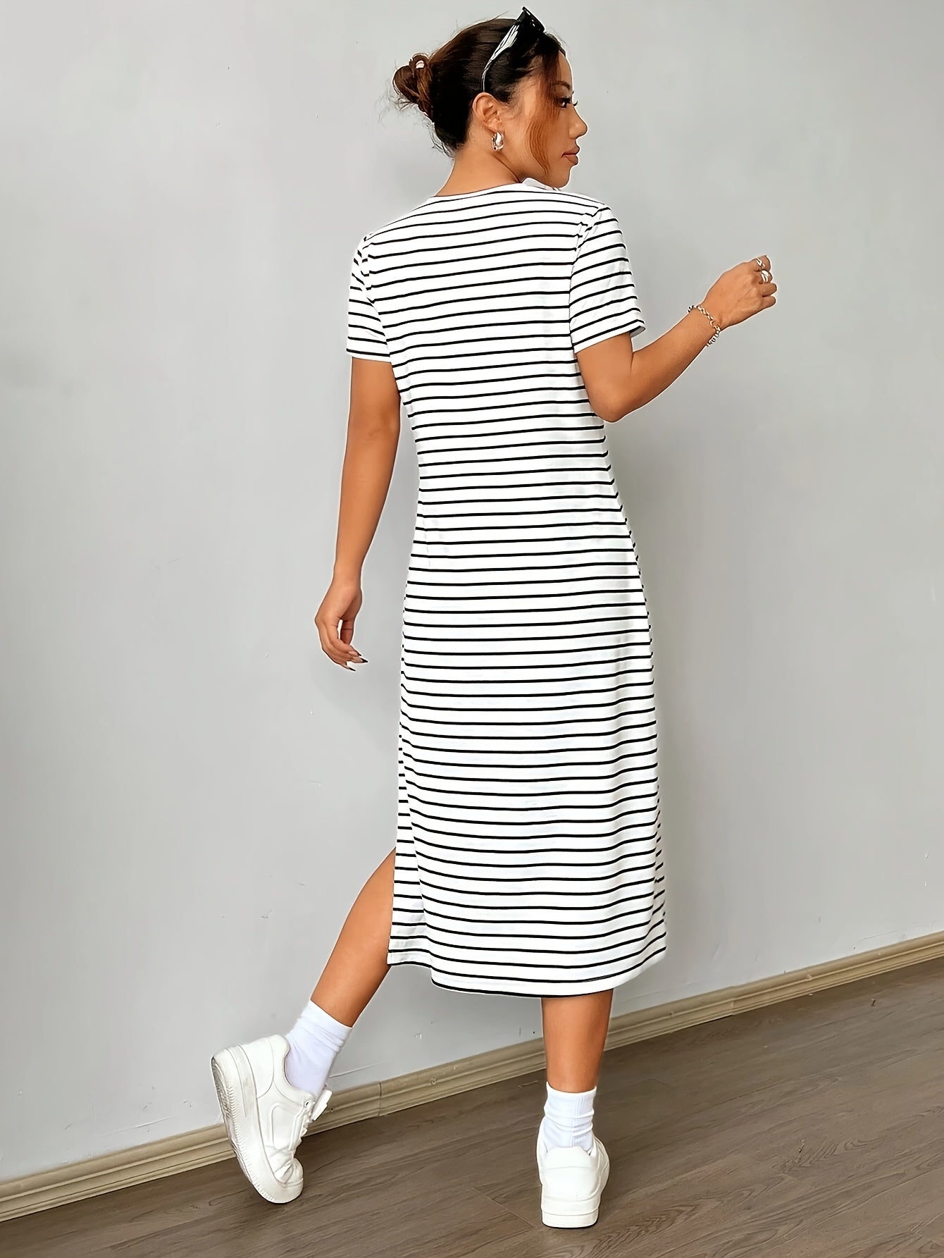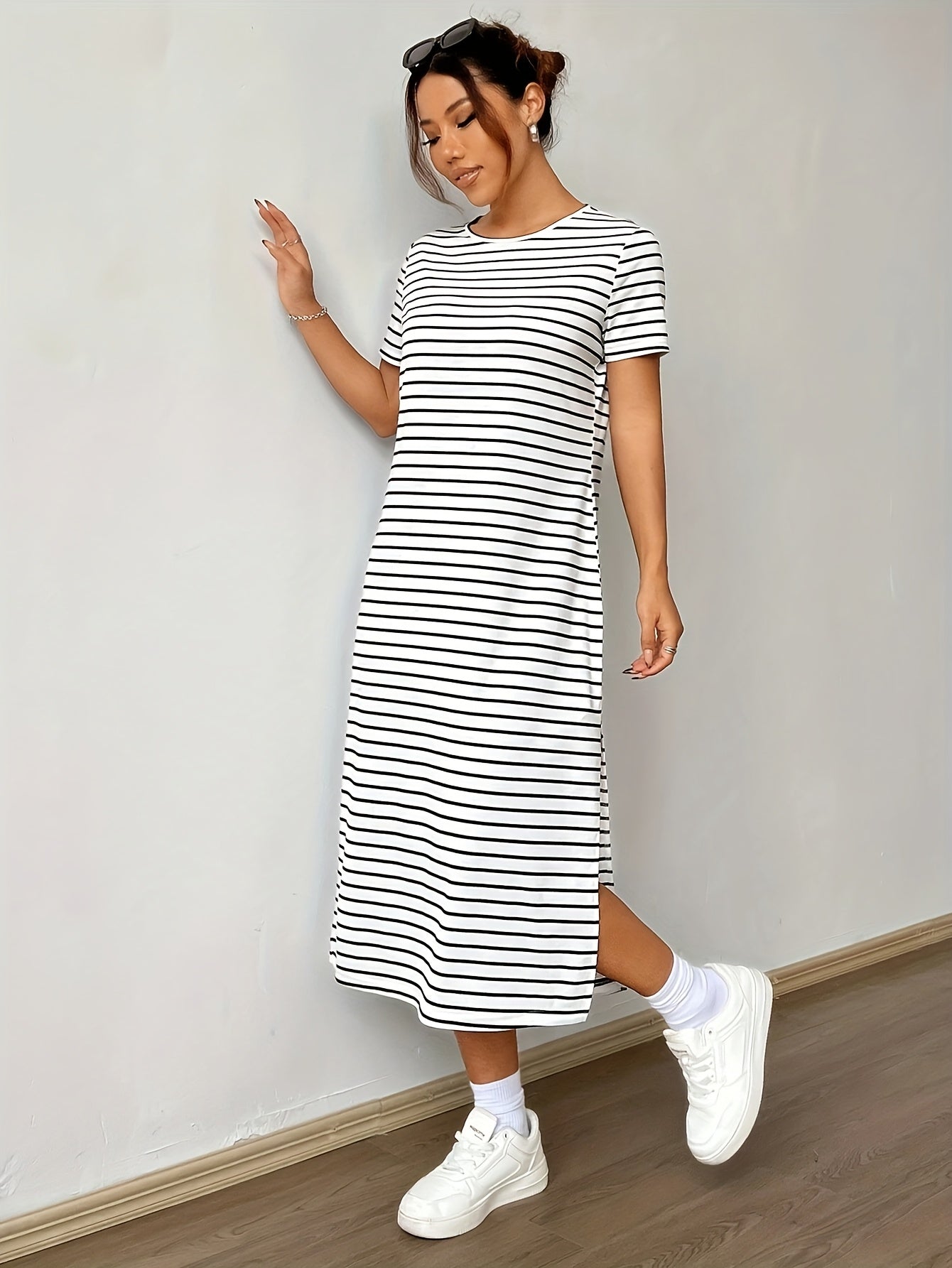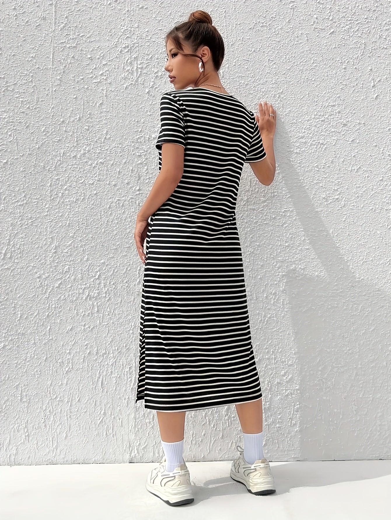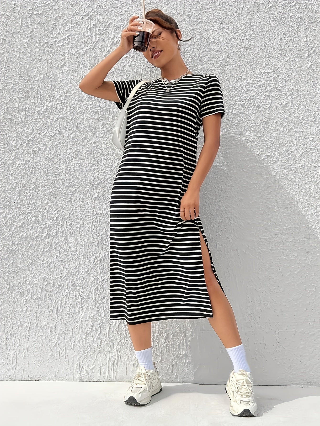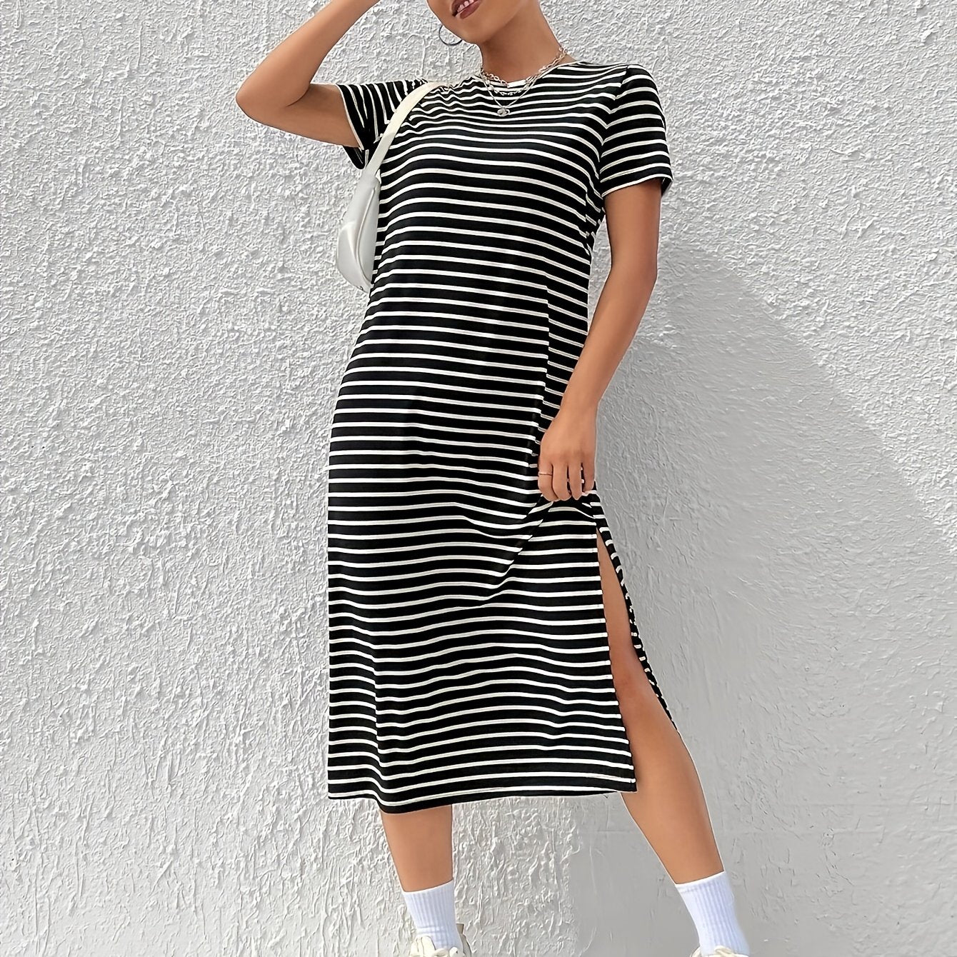 Linnea er en moderne og chic T-skjortekjole som kombinerer stil med komfort. Den flatterende splitt i siden gir kjolen et unikt preg, mens de klassiske svarte stripene tilfører en tidløs eleganse.