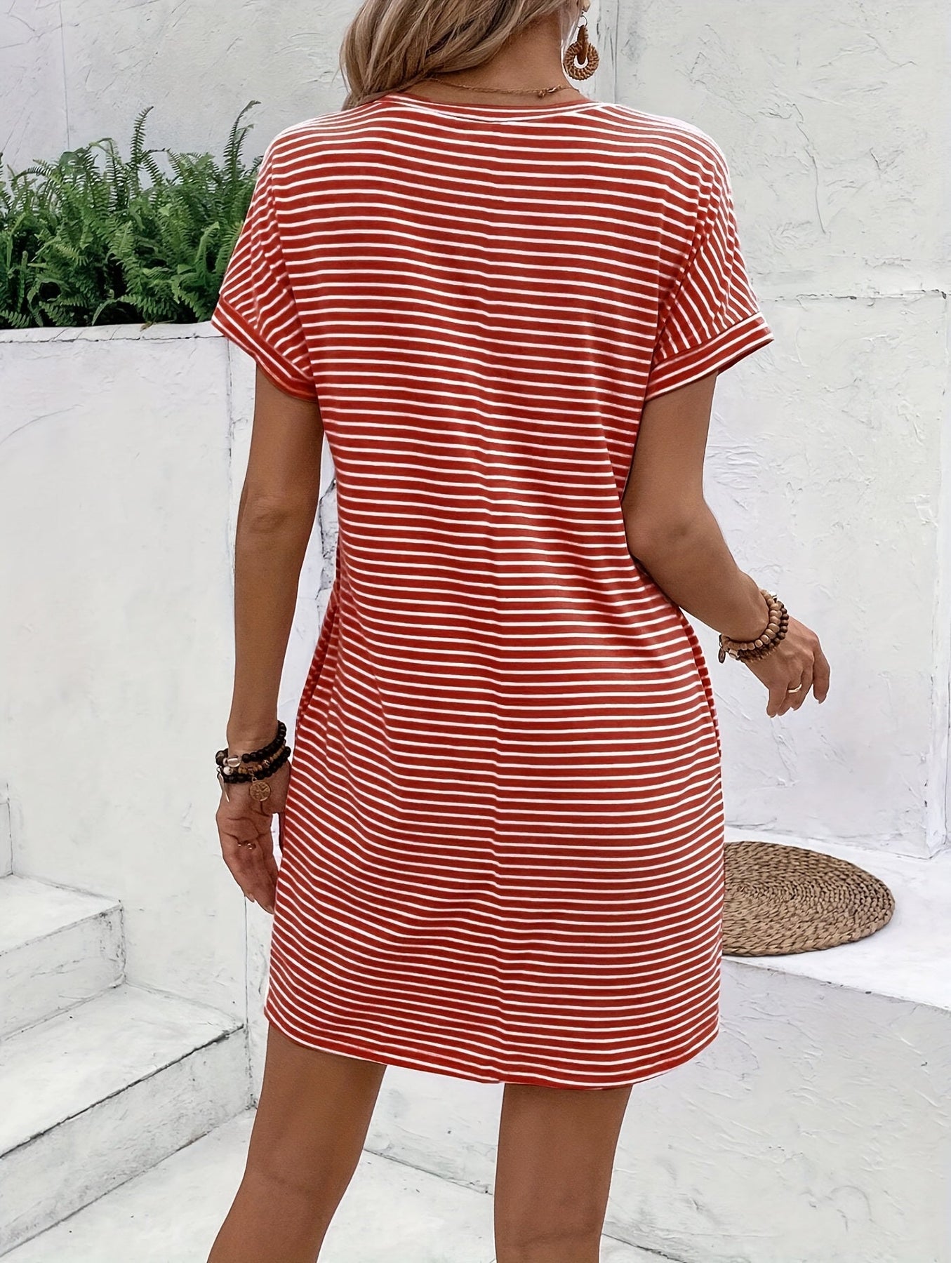 Maja er en flott og stilig T-skjortekjole som kombinerer enkelhet med eleganse. De klassiske stripene og den avslappede passformen gjør den til et perfekt valg for varme dager.